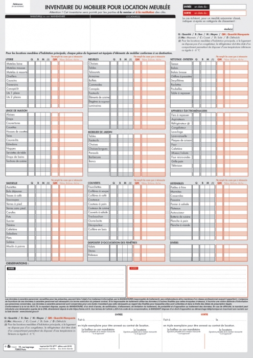L'inventaire du mobilier vous permet de lister tous les différents meubles et accessoires présents à l'entrée dans les lieux du locataire. Il est vivement conseillé dans les locations meublées et saisonnières. Il protège les biens et constitue la seule preuve de leur présence.