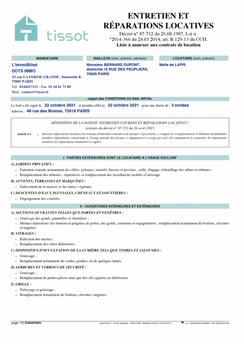 LISTE ENTRETIEN ET REPARATIONS LOCATIVES LOCATIVES SAISIE EN LIGNE